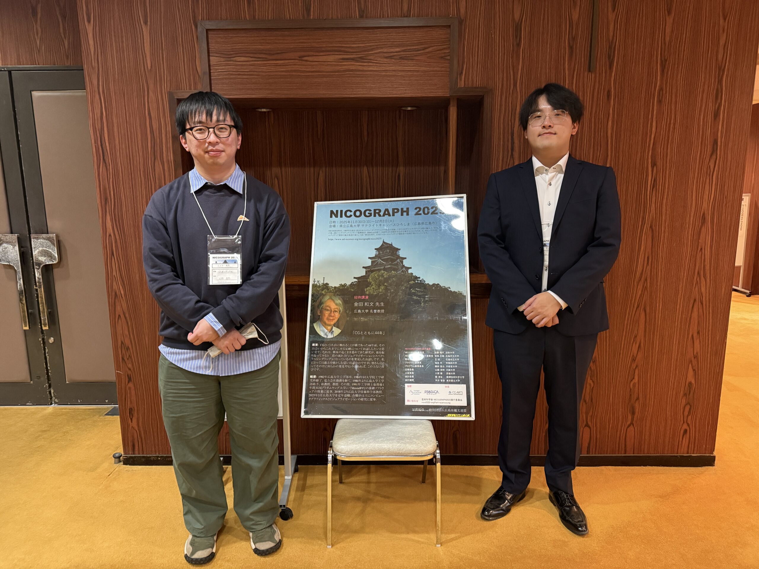 2025年11月30日(日)~12月2日(火)に、県立広島大学 サテライトキャンパスひろしまで開催されたNICOGRAPH 2025にて本コースから本学大学院に進学した2名の大学院生がポスター発表を行ないました。
