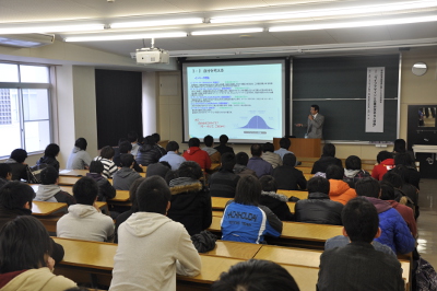 12月21日(金)、「青森県情報関連企業による出前研修」が開催され、冬季休業中にもかかわらず、2,3年生を中心に30名前後の学生が参加しました。研修会は、講師にNECソフトウェア東北株式会社 青森支社 支社長の木村 光 氏をお招きし、「ライフデザインと企業が求める人材像」と題して行われました。